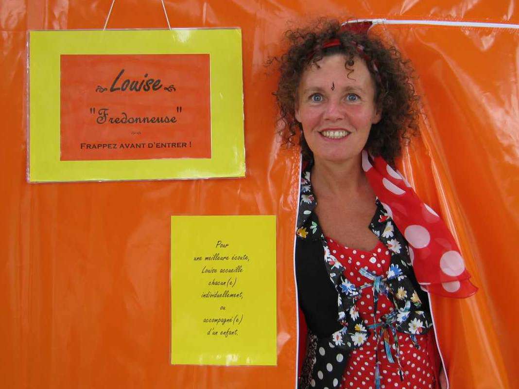 Au loin, vous apercevez une tente colorée. C’est la demeure de Louise. Sur la porte est inscrit : Louise, Fredonneuse. Frappez avant d’entrer ! C’est elle qui vous fait entrer, un(e) par un(e), ou accompagné(e) d’un enfant. Vous êtes invités à vous asseoir, et à choisir la chanson que vous voulez écouter : soit en choisissant dans une liste, soit en tirant au sort, soit en demandant à Louise d’interpréter celle qui lui plaît. Louise se donne le ton à l’aide d’un drôle d’instrument (pitch pipe) et commence à fredonner. Voilà !